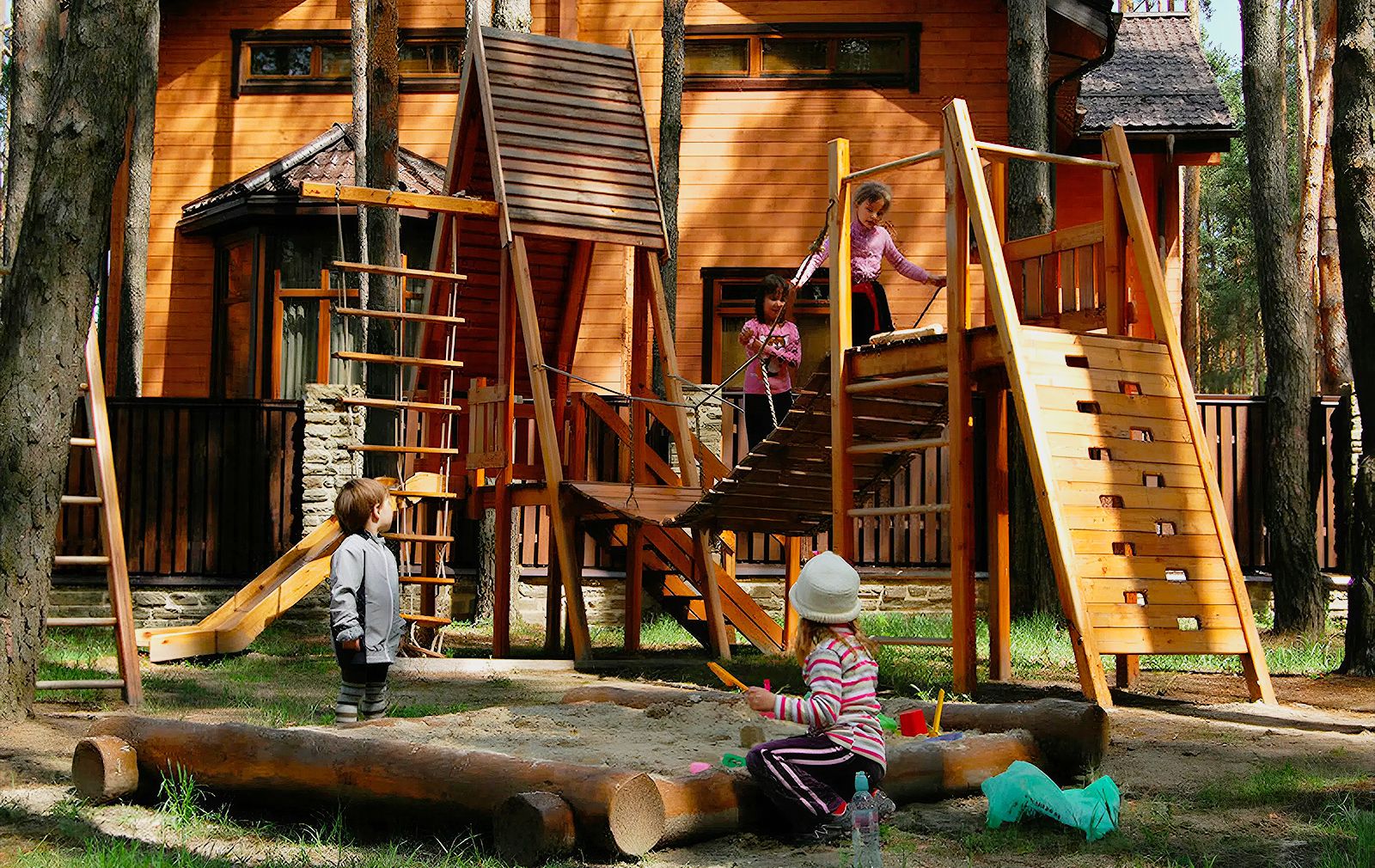 - Детские городки и верёвочный парк для активных игр.