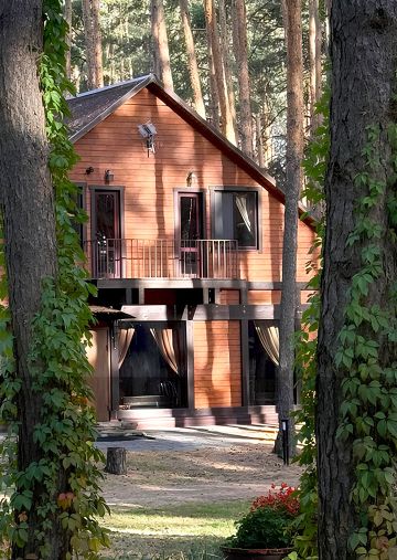 Из домика открывается вид на зелёную территорию базы и хвойные деревья. Благодаря окружающему сосновому бору здесь всегда чувствуется свежий воздух, а лёгкий аромат хвои делает атмосферу особенно приятной. Утром слышно пение птиц, днём можно выйти на террасу или прогуляться по лесу, а вечером — провести время всей компанией на улице или в гостиной. Все домики поддерживаются в аккуратном состоянии: чистые комнаты, современная мебель, продуманные спальные места и уютная атмосфера создают ощущение домашнего уюта.